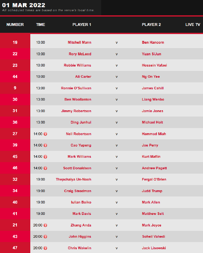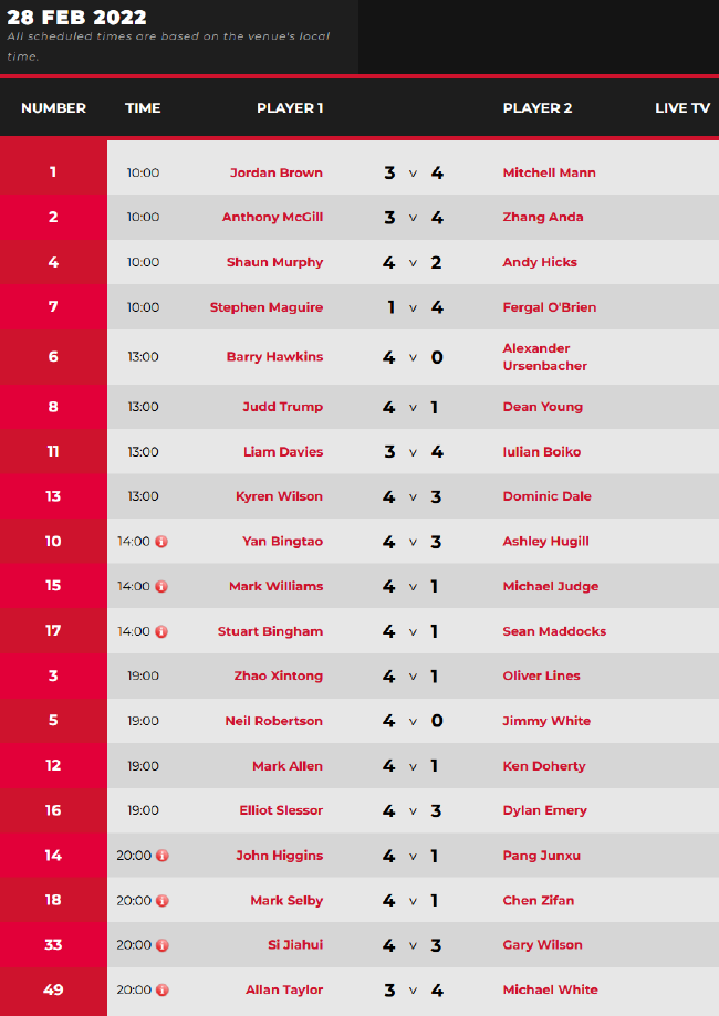 2022斯诺克威尔士公开赛正赛第2比赛日赛程
