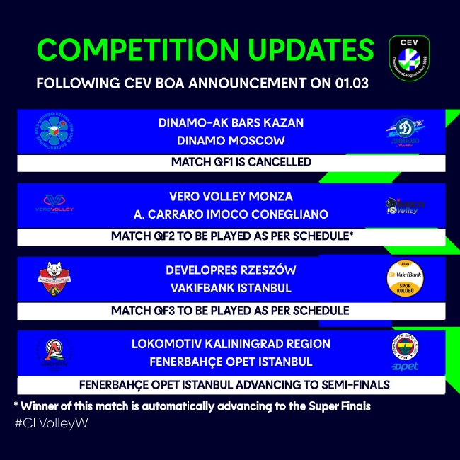 北京时间3月2日消息,根据昨日发布的对俄罗斯实施的禁赛令,欧洲排球联合会于今日对2022年男女排欧冠联赛和男排欧联杯的赛程进行了调整。其调整原则为但凡有俄罗斯俱乐部参赛的,均判另一方不战而胜晋级;在俄罗斯俱乐部之间进行的比赛直接取消。