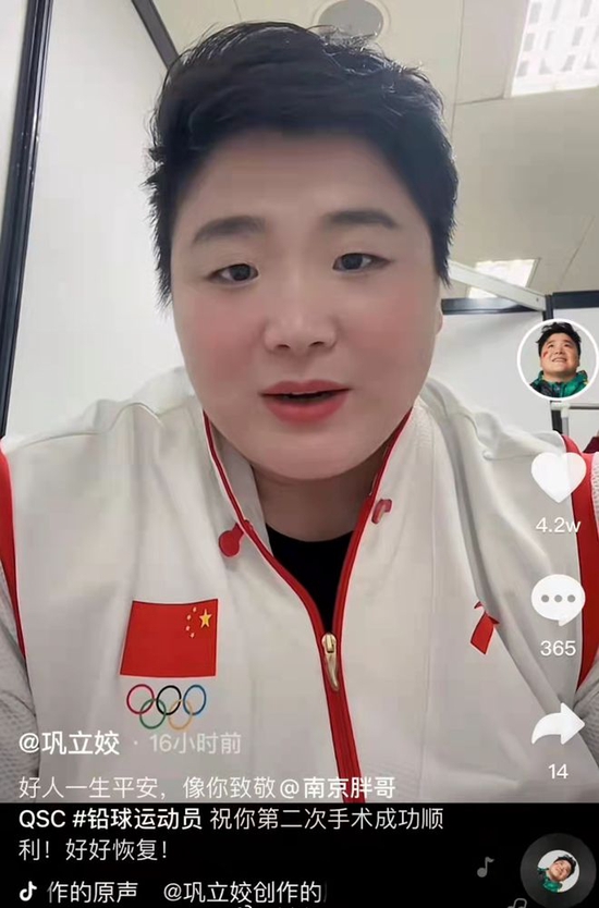 巩立娇对南京胖哥做出回复:“首先感谢你的见义勇为,也感谢你这么热爱铅球这项运动,我相信热爱体育的人都有一颗正能量的心,祝你第二次手术顺利,现在放平心态养身体,等你康复之后我们一起切磋。”